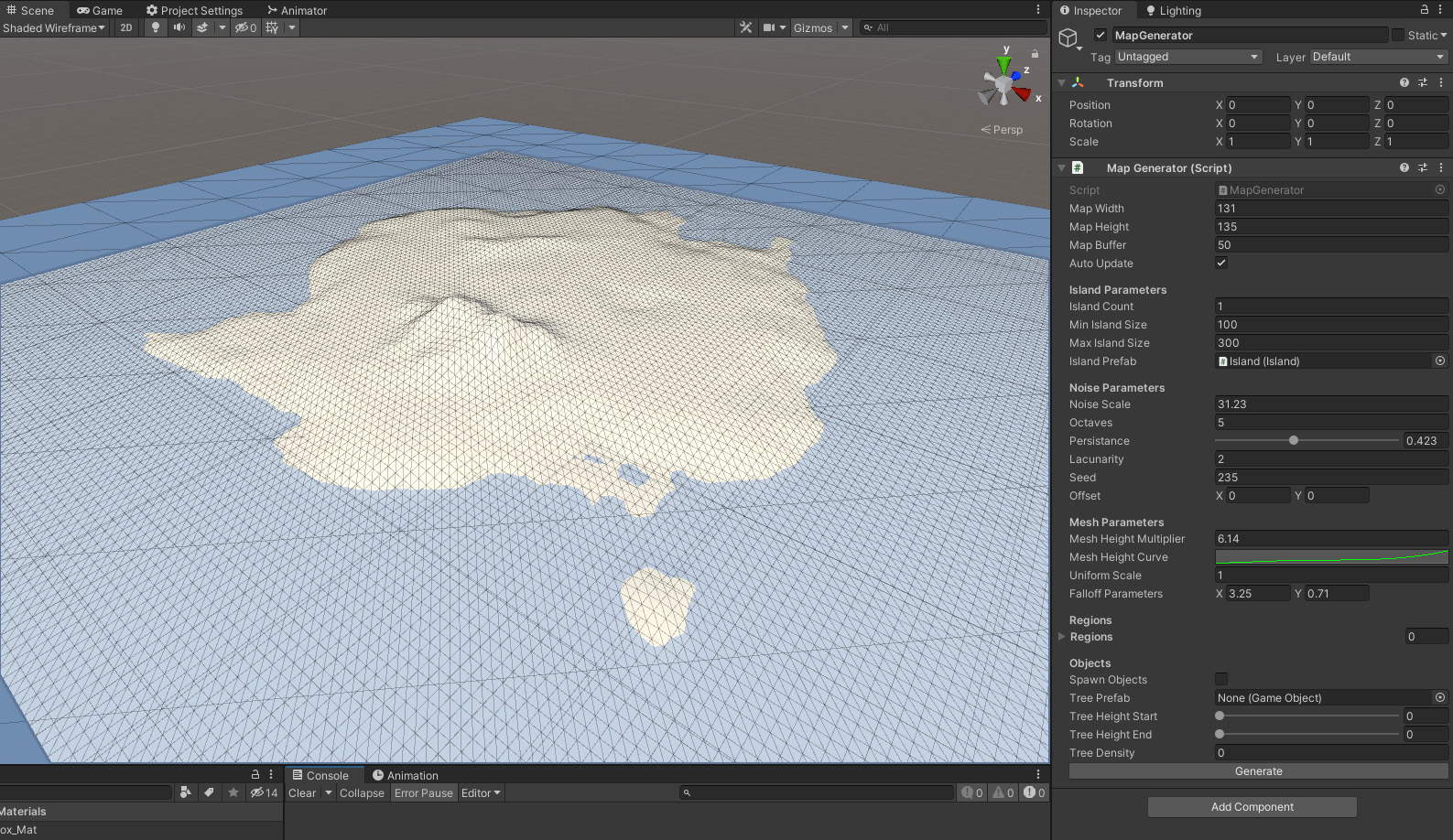 Something I've been putting particular effort into that I've often skipped over in previous projects is proper organisation of the Unity inspector. While this isn't part of my assessment, by grouping variables under headings and using the Range attribute I can understand the inspector much more clearly at a glance, which is especially important when so many values are exposed. I'll colour this mesh with Shader Graph by setting vertex colours depending on their height, and populate the island with trees and rocks - probably with more Perlin noise multiplied by the terrain noise within a certain height range. In my forest fire game below I place trees at regular intervals with a slight random offset which I think works well for a forest but would look odd for a desert island which would need sparse clumps of trees.